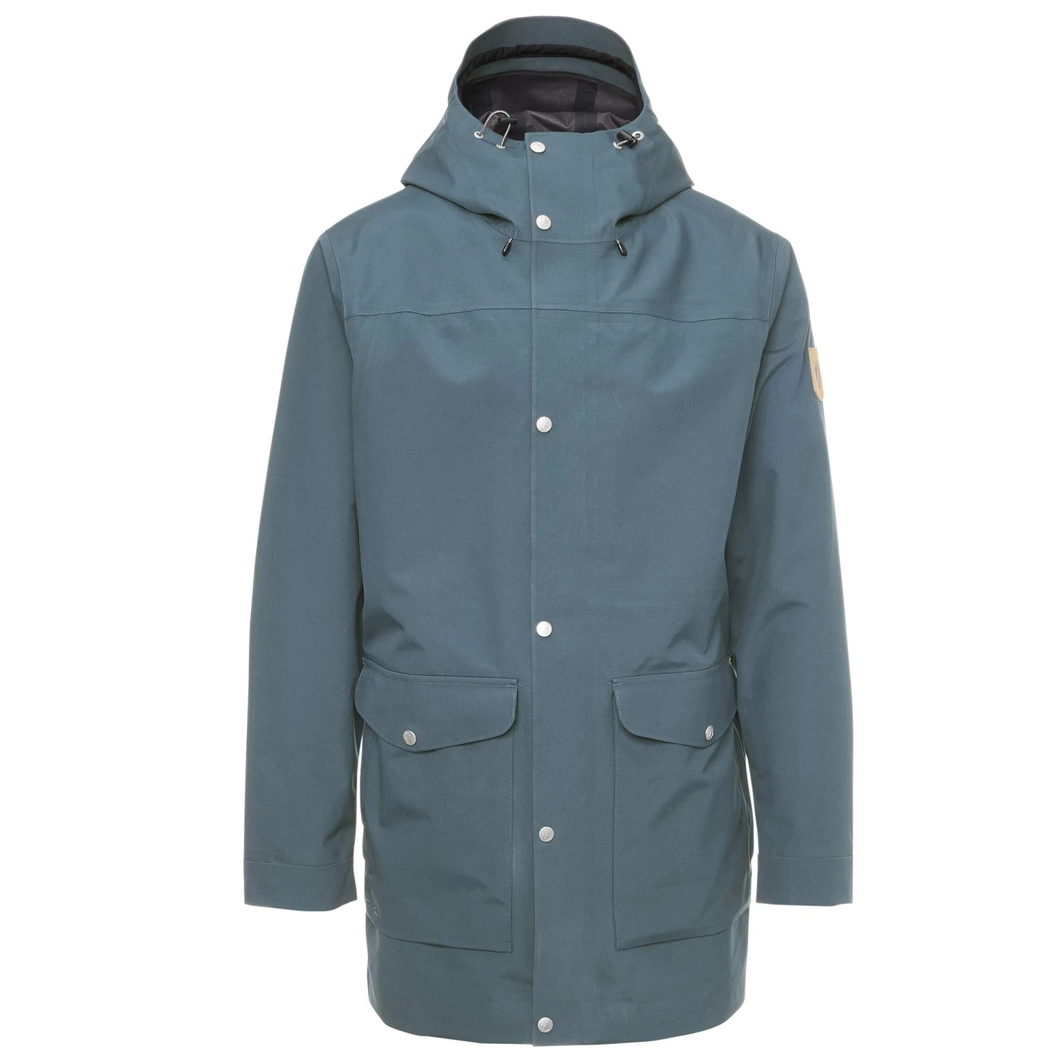 Die atmungsaktive Jacke besteht aus 3-lagigem Eco-Shell, einem nachhaltigen Fjällräven-Material aus recyceltem Polyester. Das mit einer PFC-freien Imprägnierung behandelte Gewebe hat einen weichen Materialgriff, ist dennoch schön robust und dadurch besonders langlebig. Ihr etwas längerer Schnitt und die großzügige Passform bieten dir ein Plus an Komfort und ausreichend Platz für eine weitere Bekleidungsschicht. Die feste Kapuze ist einfach und schnell regulierbar und bietet dir an besonders ungemütlichen Tagen einen zusätzlichen Schutz. Zwei großzügige Pattentaschen und eine innenliegende RV-Tasche sorgen für ausreichend Stauraum, wenn du einmal ohne Tasche oder Rucksack unterwegs sein solltest.