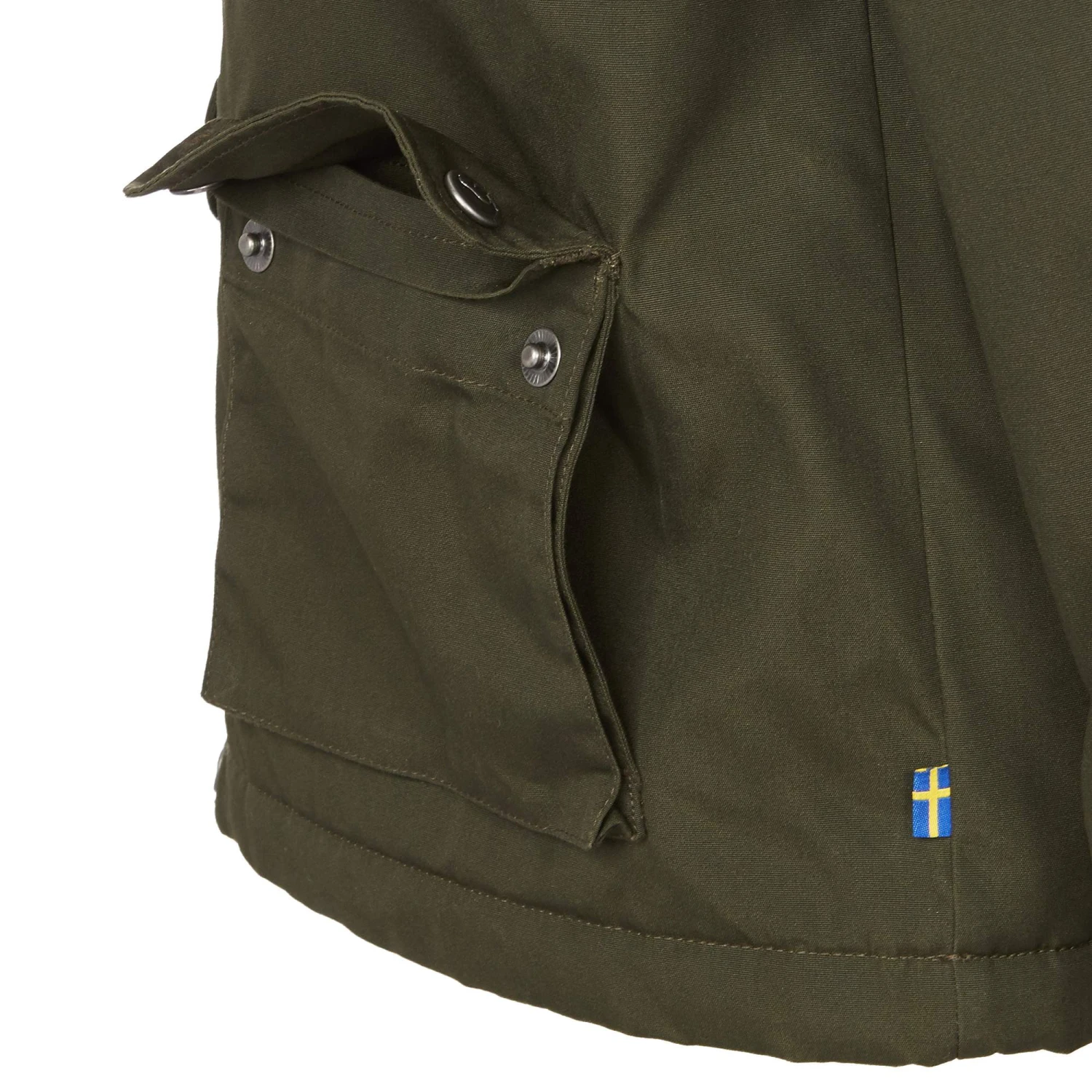 - 2 mit Knopfleiste abgedeckte Fronttaschen mit seitlichem Einschub